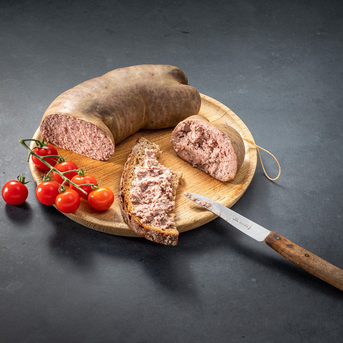 Zutaten: Schweinefleisch 40%, Schweinekopffleisch 25%, Schweineleber 19%, Schweinespeck, Trinkwasser, Speisesalz, Zwiebeln, Zucker, Gewürze, Würze, Dextrose, Gewürzextrakte (u.a. Sellerie), Geschmacksverstärker: Mononatriumglutamat, Konservierungsstoff: Natriumnitrit, Naturdarm vom Schwein, Buchenholzrauch