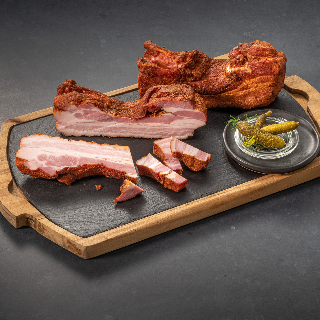 Zutaten: Schweinebauch, Speisesalz, Gewürze (u.a. Sellerie), Zucker, Dextrose, Würze, Gewürzextrakte, natürliches Aroma, Geschmacksverstärker: Mononatriumglutamat, Stabilisator: Diphosphate, Antioxidationsmittel: Natriumascorbat, Säuerungsmittel: Weinsäure, Citronensäure, Konservierungsstoff: Natriumnitrit, Buchenholzrauch. Kann Spuren von Senf enthalten.