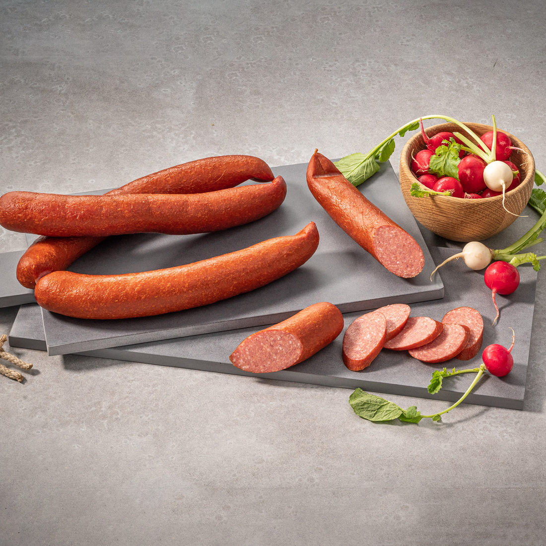 Zutaten: Schwein- und Rindfleisch 92%, Speisesalz, Gewürze, Zucker, Gewürzextrakte (u.a. Sellerie), Knoblauch, Senfmehl, Geschmacksverstärker: Mononatriumglutamat, Stabilisatoren: Diphosphate, Natriumcitrat, Antioxidationsmittel: Natriumascorbat, Ascorbinsäure, Konservierungsstoff: Natriumnitrit, Naturdarm vom Schaf, Buchenholzrauch
