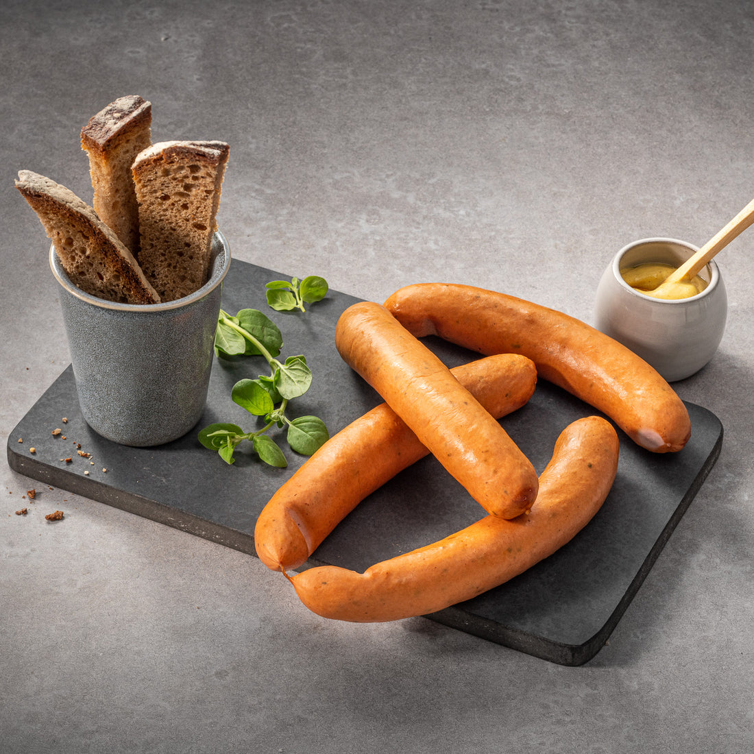 Zutaten: Rind- und Schweinefleisch 82%, Speisesalz, Gewürzextrakte, Dextrose, Zwiebel, Gewürze (u.a. Senf), Kräuter, Knoblauch, Stabilisator: Diphosphate, Geschmacksverstärker: Mononatriumglutamat Antioxidationsmittel: Ascorbinsäure, Natriumascorbat, Konservierungsstoff: Natriumnitrit, Naturdarm vom Schaf, Buchenholzrauch